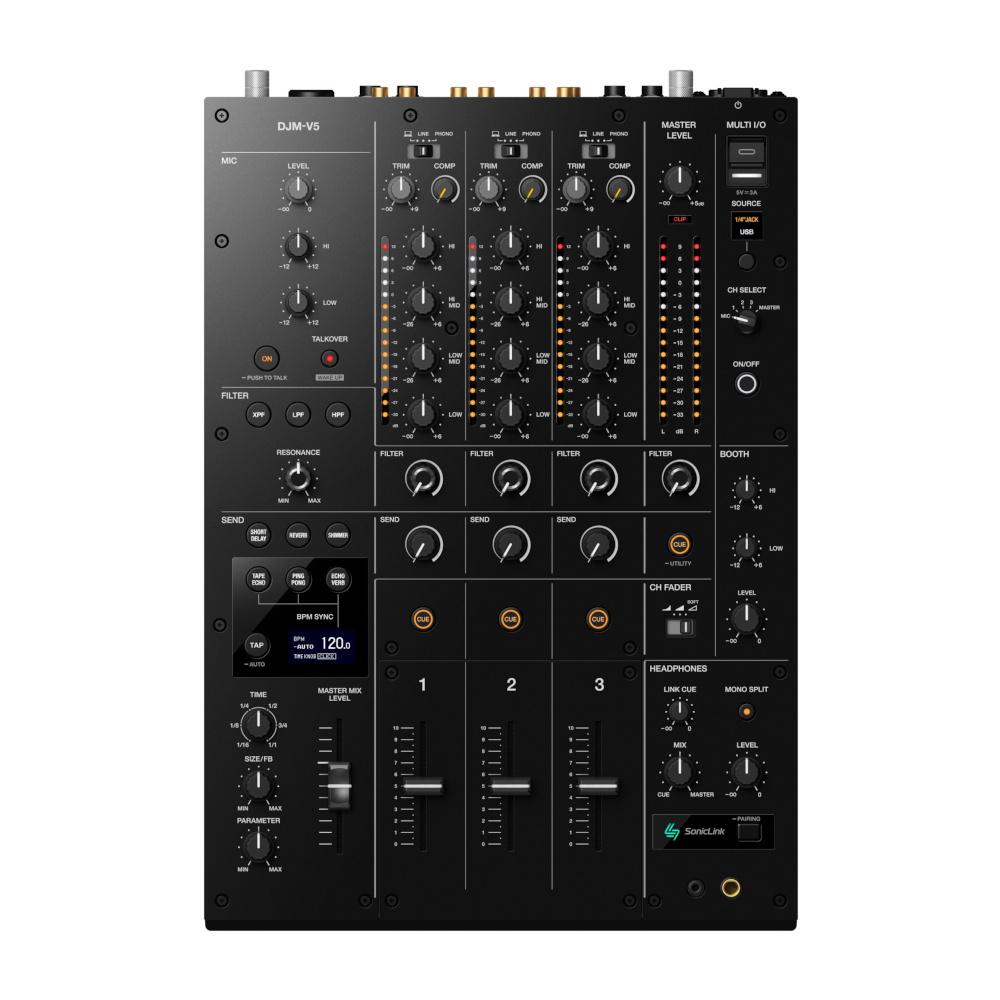 De mixer beschikt over een ingebouwde SonicLink-zender voor ultra-low-latency draadloze monitoring met compatibele headphones, waardoor je vrijer kan bewegen in de booth zonder kabels. Met PRO DJ LINK, USB-C connectiviteit en uitgebreide in- en uitgangen integreert de DJM-V5 moeiteloos met CDJ’s, laptops en externe effectprocessors.